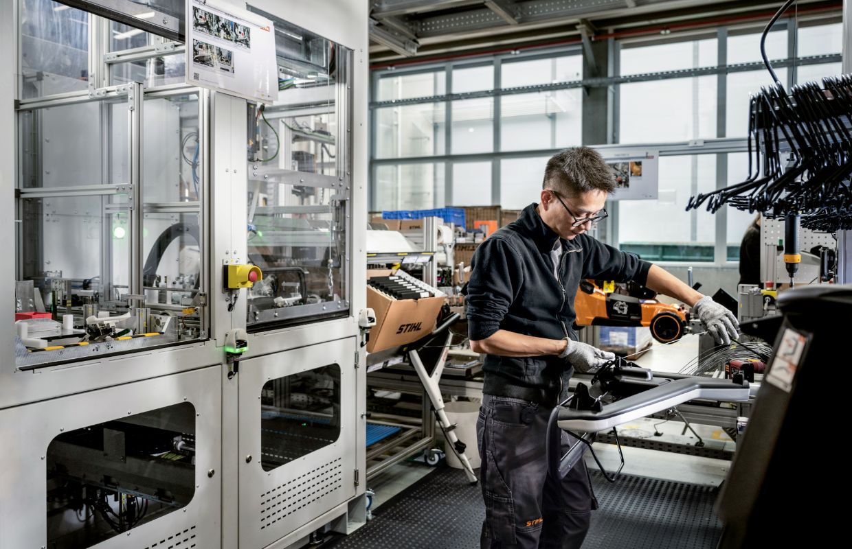 Das skalierbare System bietet maximale Flexibilität, um auf Marktschwankungen zu reagieren. Statt auf traditionelle Fertigungsstrukturen setzt STIHL auf eine lose Anordnung von Arbeitsplätzen und Automatikstationen, verbunden durch ein fahrerloses Transportsystem. Automatisierte Prozesse, wie die zentrale Verschraubung und die hochautomatisierte End-of-Line-Anlage, ergänzen die manuelle Expertise der Mitarbeitenden.